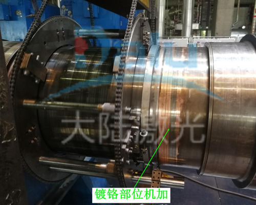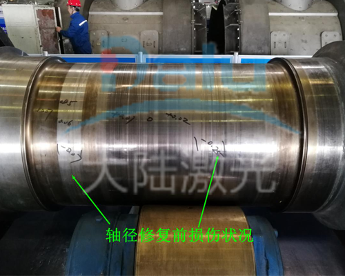 2019年11月18日大陸激光在山東聊城電廠現(xiàn)場,對70噸發(fā)電機(jī)組一個主軸徑及兩處密封軸徑,三個損傷部位進(jìn)行了現(xiàn)場激光再制造修復(fù)。該發(fā)電機(jī)是由德國西門子公司生產(chǎn)的,因長時間超負(fù)荷運轉(zhuǎn),造成非驅(qū)動端軸主軸徑磨損、拉傷,損傷深度約為0.5mm。兩處密封軸徑磨損,存在漏氫現(xiàn)象,曾做刷鍍處理,使用一段時間后仍然漏氣,效果不理想,已經(jīng)嚴(yán)重影響機(jī)組正常運行,需對損傷軸頸進(jìn)行修復(fù),恢復(fù)原始尺寸。為解決漏氣問題,大陸激光組織人員及相關(guān)設(shè)備前往現(xiàn)場進(jìn)行修復(fù)。