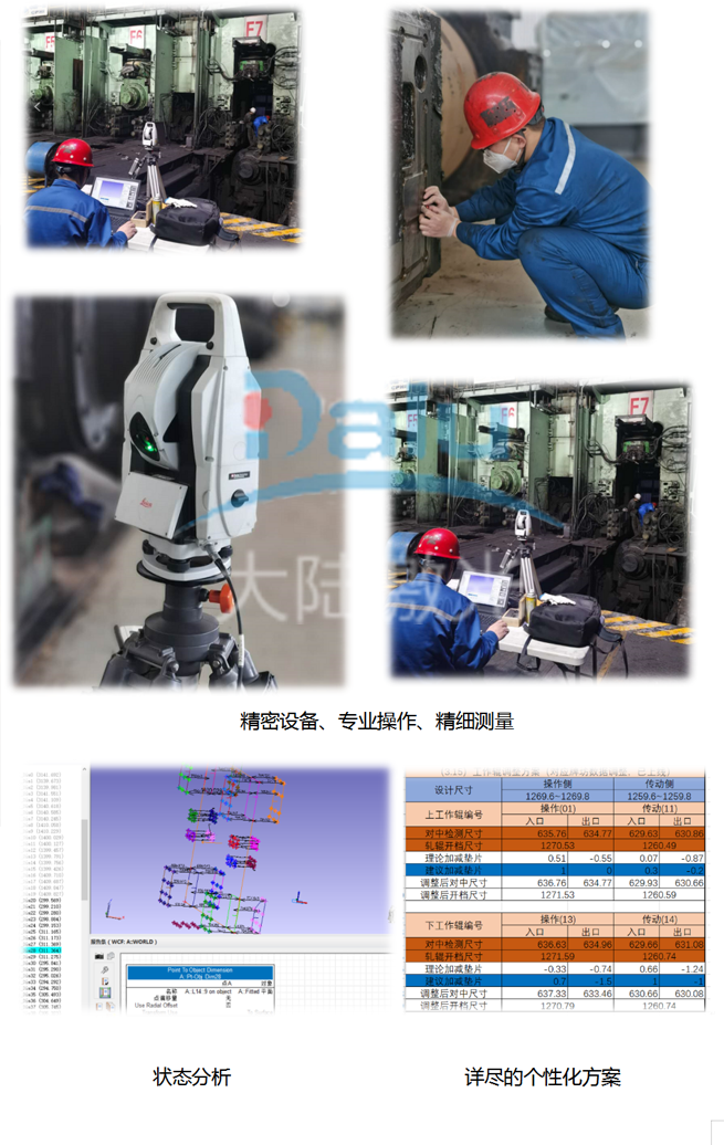 根據(jù)與對方溝通的信息,制定完備檢測方案,3月12日及時趕到用戶現(xiàn)場。與用戶對接的技術討論會上,發(fā)現(xiàn)用戶在軋機調整、故障判斷上有一定的誤區(qū),我們根據(jù)多年來在牌坊修復看積累的經(jīng)驗和理論數(shù)據(jù)判斷,給出合理的檢測方案,并說服用戶的相關技術人員接受我們的檢測方案。
